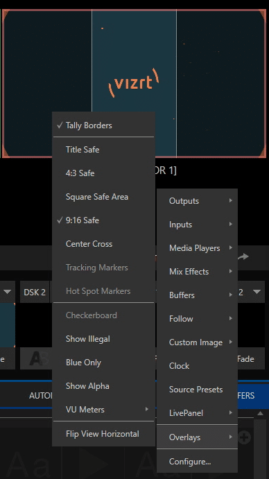 - TriCaster is going to offer you Safe Zone overlays on the viewports, so you will know what is going to get cropped from the 16:9 source. Right click on the viewport, navigate to Overlays and choose “9:16 Safe” – this can be applied on any viewport (inputs, media players, PVW, PGM)