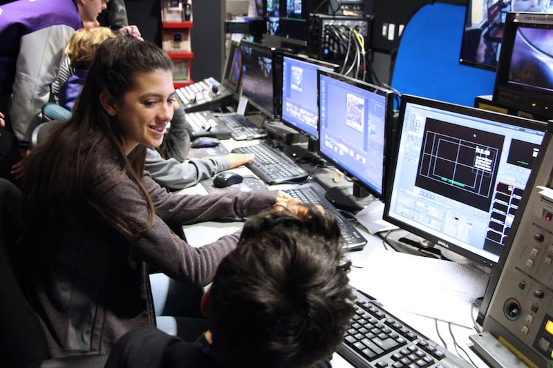 The students also take turns delivering an interactive presentation using the Magic Window, which is a giant touch screen monitor. They’re able to speak extemporaneously about their chosen subject, without the help of a teleprompter, since they’ve done their own research and compiled the accompanying imagery. The students are also expected to produce a feature segment on any topic of their choice every three weeks. On deadline day, several student/content producers evaluate the video clips for use in the newscast as well as grade the work.