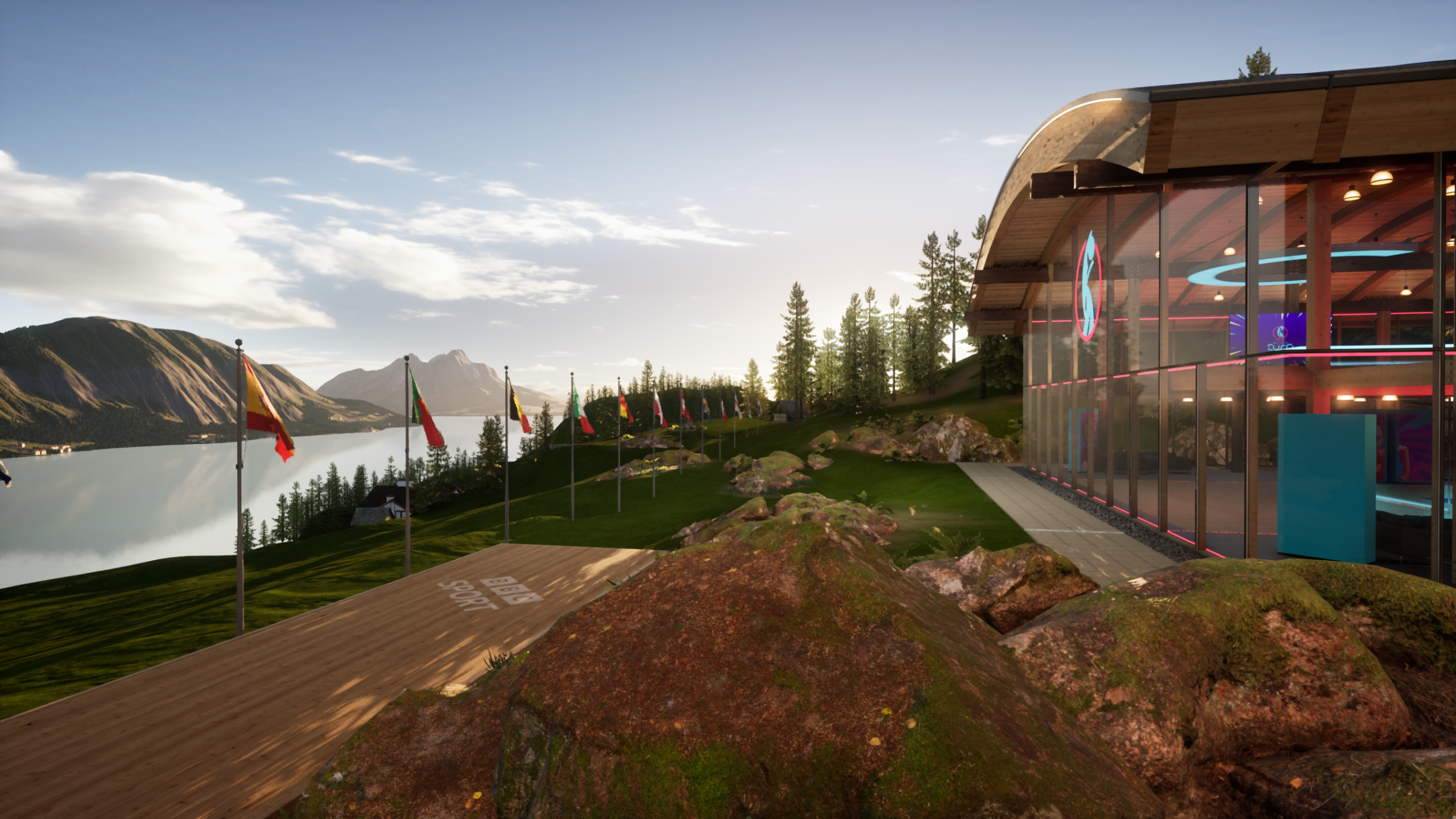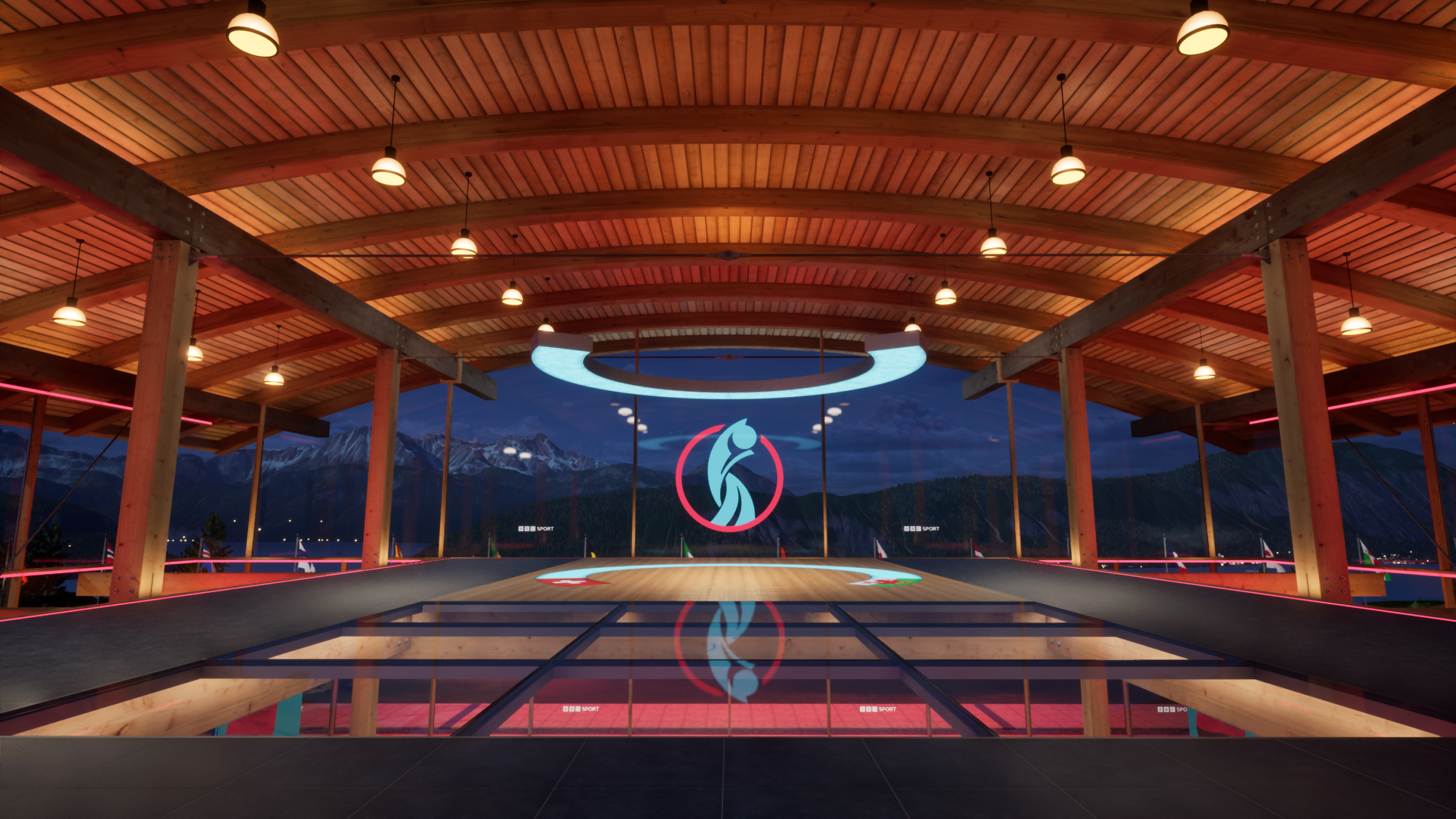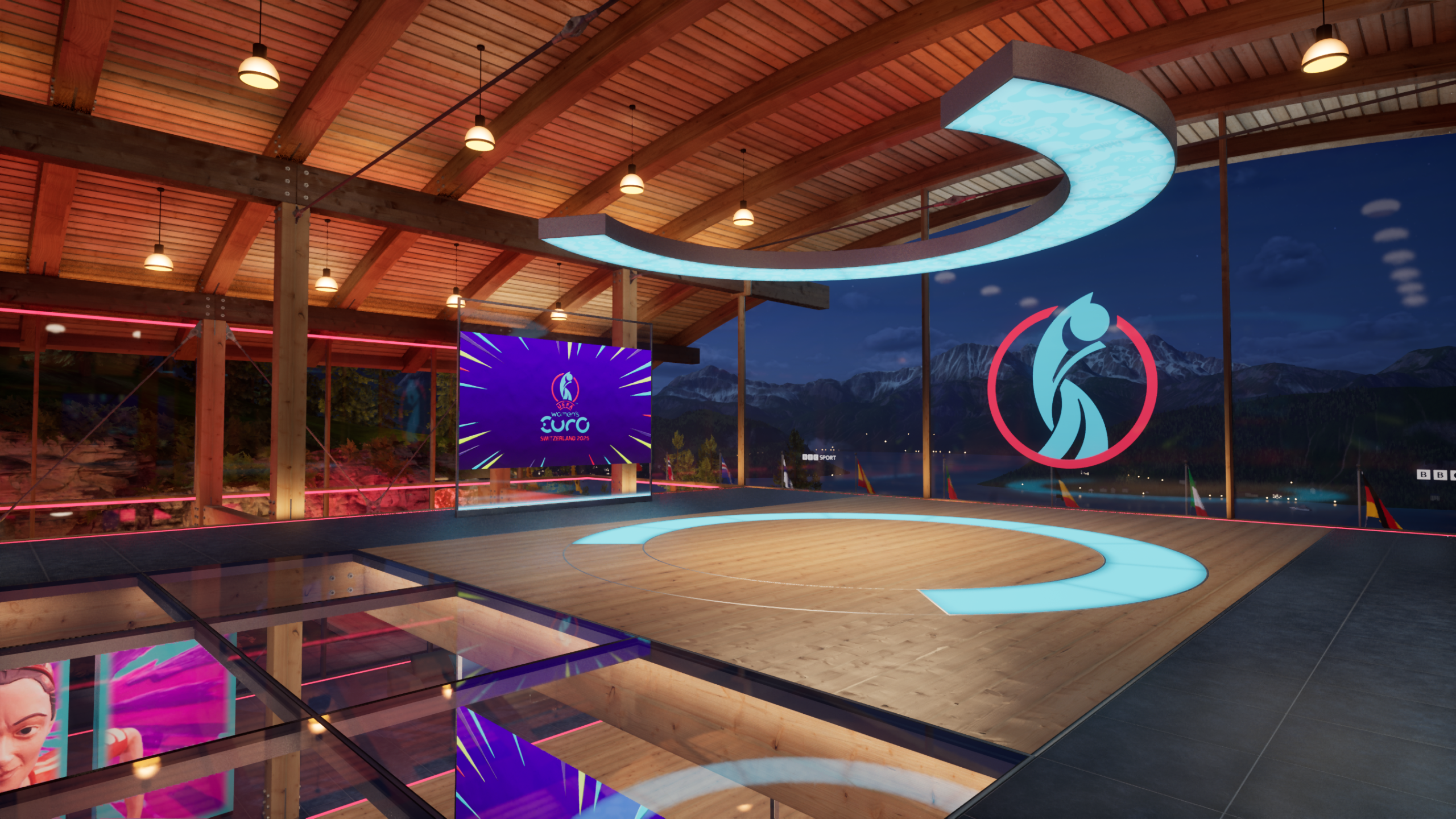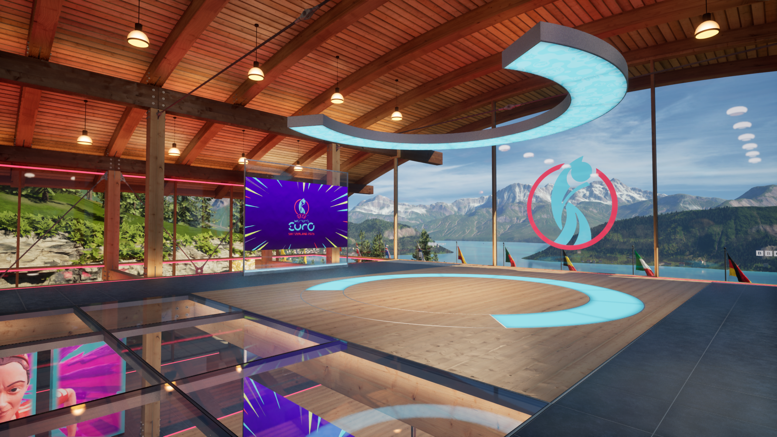 Designed to reflect the Swiss setting of the tournament, the virtual set placed presenters in a mountaintop pavilion overlooking Lake Lucerne. Behind them were sweeping alpine views, fluttering national flags, and soft skies shifting to reflect the time of day. The XR studio became more than a backdrop, it helped ground the coverage in the look and feel of Switzerland, while giving producers the flexibility of a fully virtual environment.